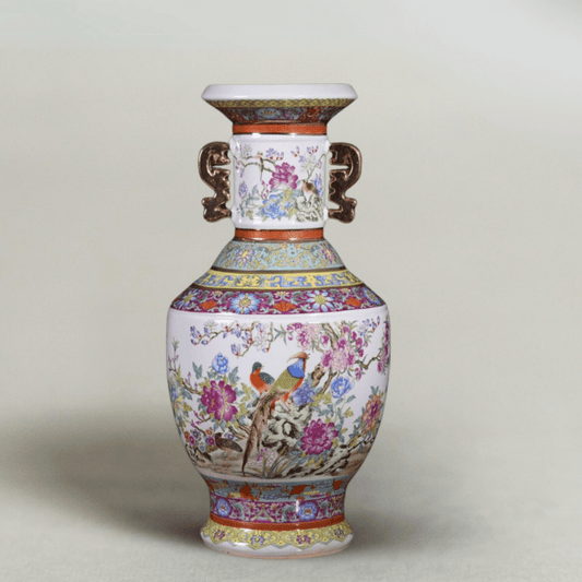 Imperial Qianlong Era-Inspired Vase, Enamel Painted Double-Ear Bird & Floral, Gilded Porcelain Floor Vase for Foyer, 24'' H
