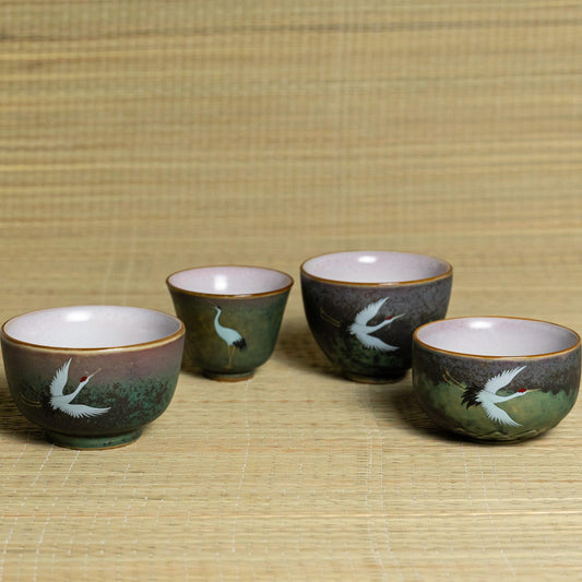 Tea & Sake Cups Wabi Sabi Crane Elegance Ceramic Handmade Set