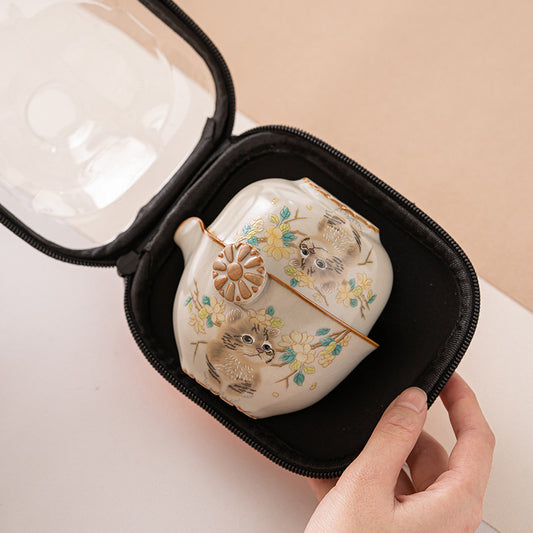 Portable Hand-Painted Cat Themed Porcelain Travel Tea Set